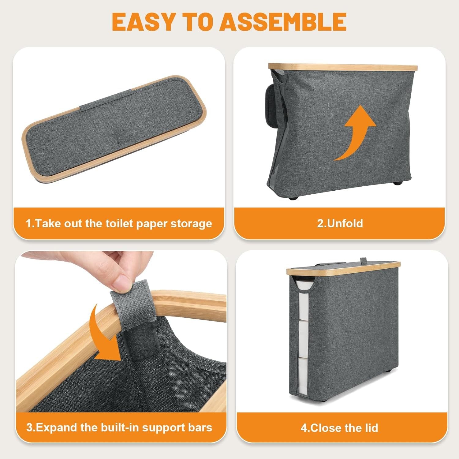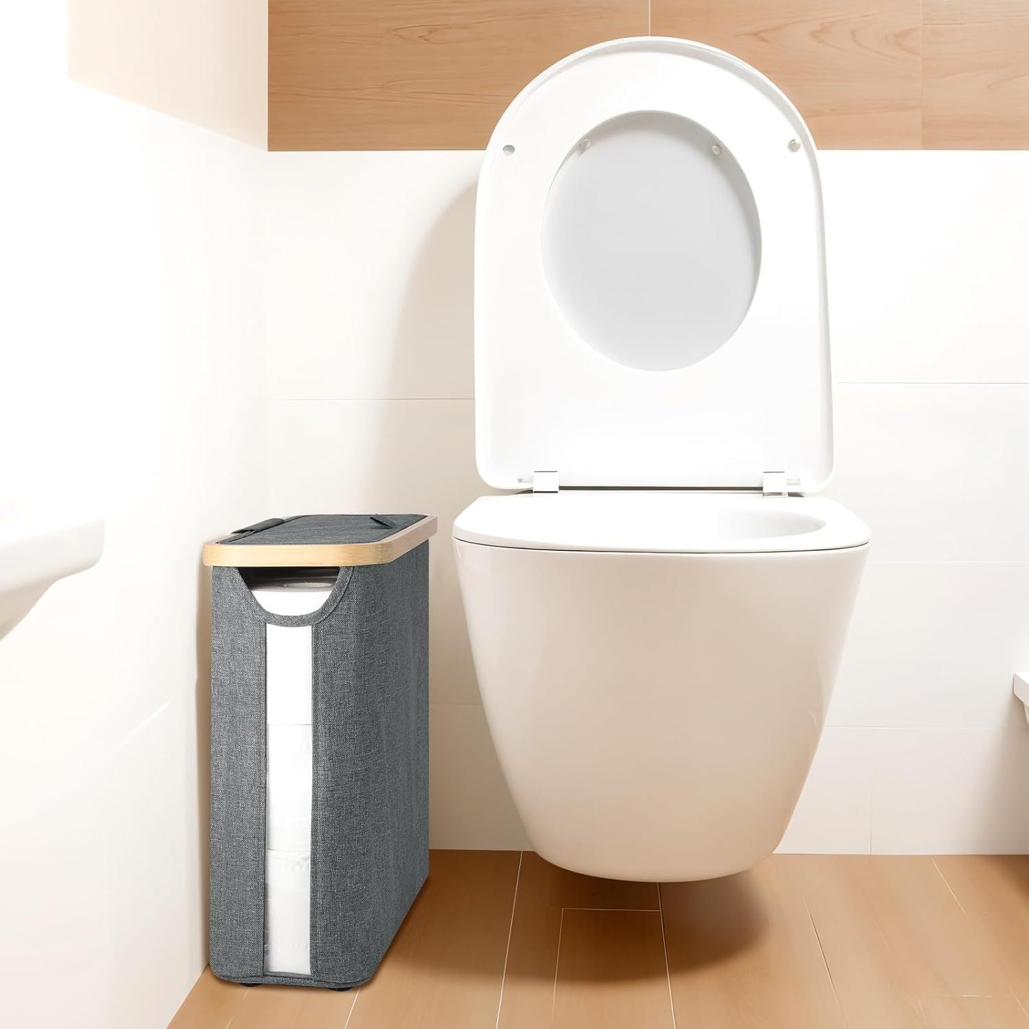 Toilet Paper Storage Basket with Lid – Bamboo & Waterproof Fabric Holder for Bathroom, RV & Small Spaces (Fits 9–12 Rolls)